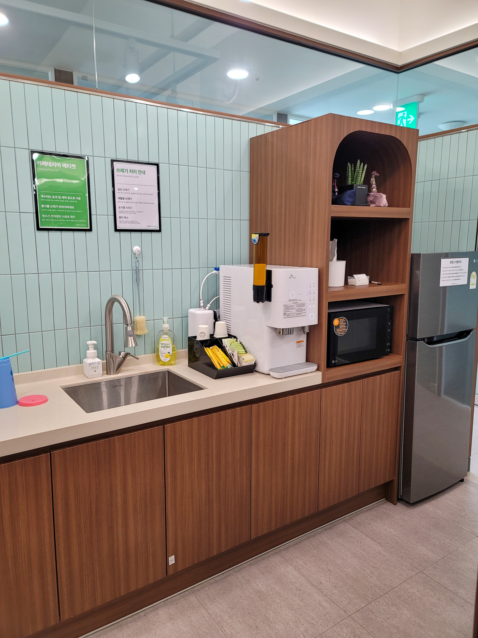 넓은 라운지, 카페테리아 공간, 생활가전제품, 사무OA존 공간등