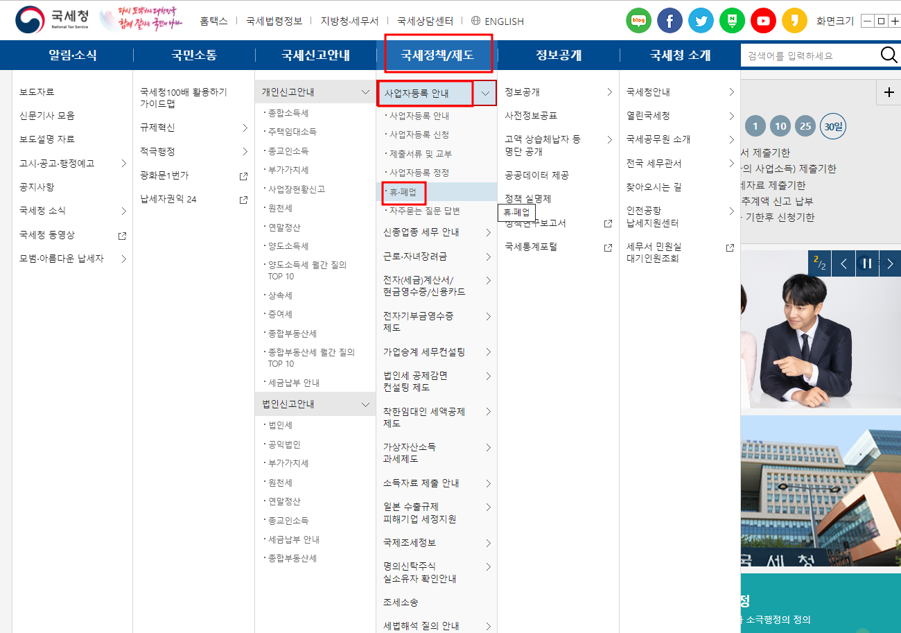 국세정책/제도-사업자등록 안내-휴·폐업> 에서 확인할 수 있습니다.