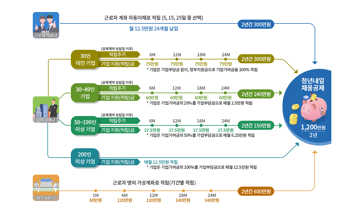 - 청년은 매월 125,000원 납입하며 기업은 2년간 최대 300만 원 적립해야 합니다