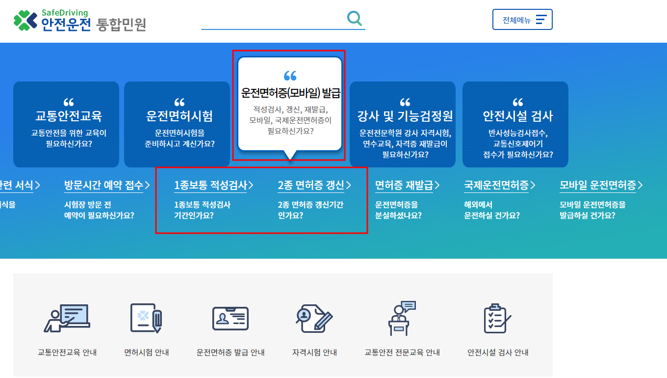 1종보통적성검사 와 2종면허증갱신 중 해당하는 사항을 클릭해 주세요