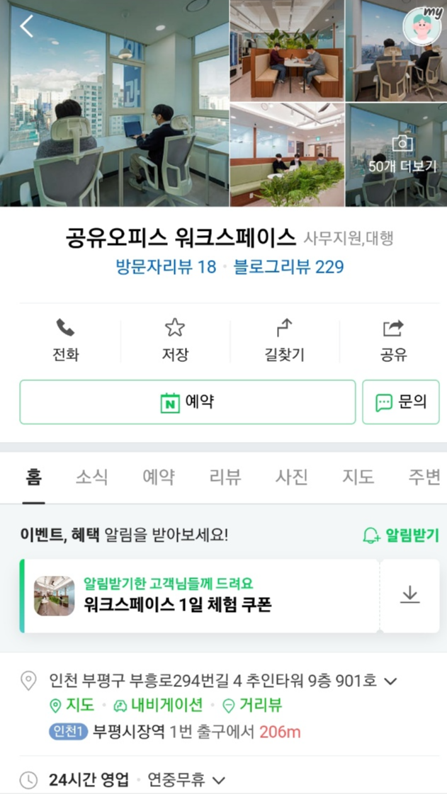위 링크에 접속을 하면 공유오피스 워크스페이스 네이버플레이스에 접속이 됩니다