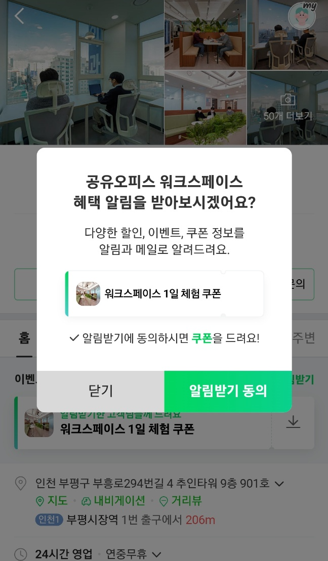 홈에 보면 워크스페이스 1일 체험 쿠폰이 있습니다